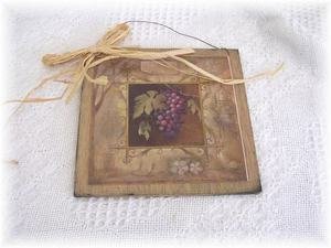 We've sealed this Purple Grapes print onto wood giving it a framed appearance. The background color is a creamy tan color with touches of brown and black to accent the print. It measures approximately 7" squared by 1/4" thick (wood dimensions not including hanger). We've added a rusty tin wire hanger accented with a raffia ribbon bow for easy hanging and added charm